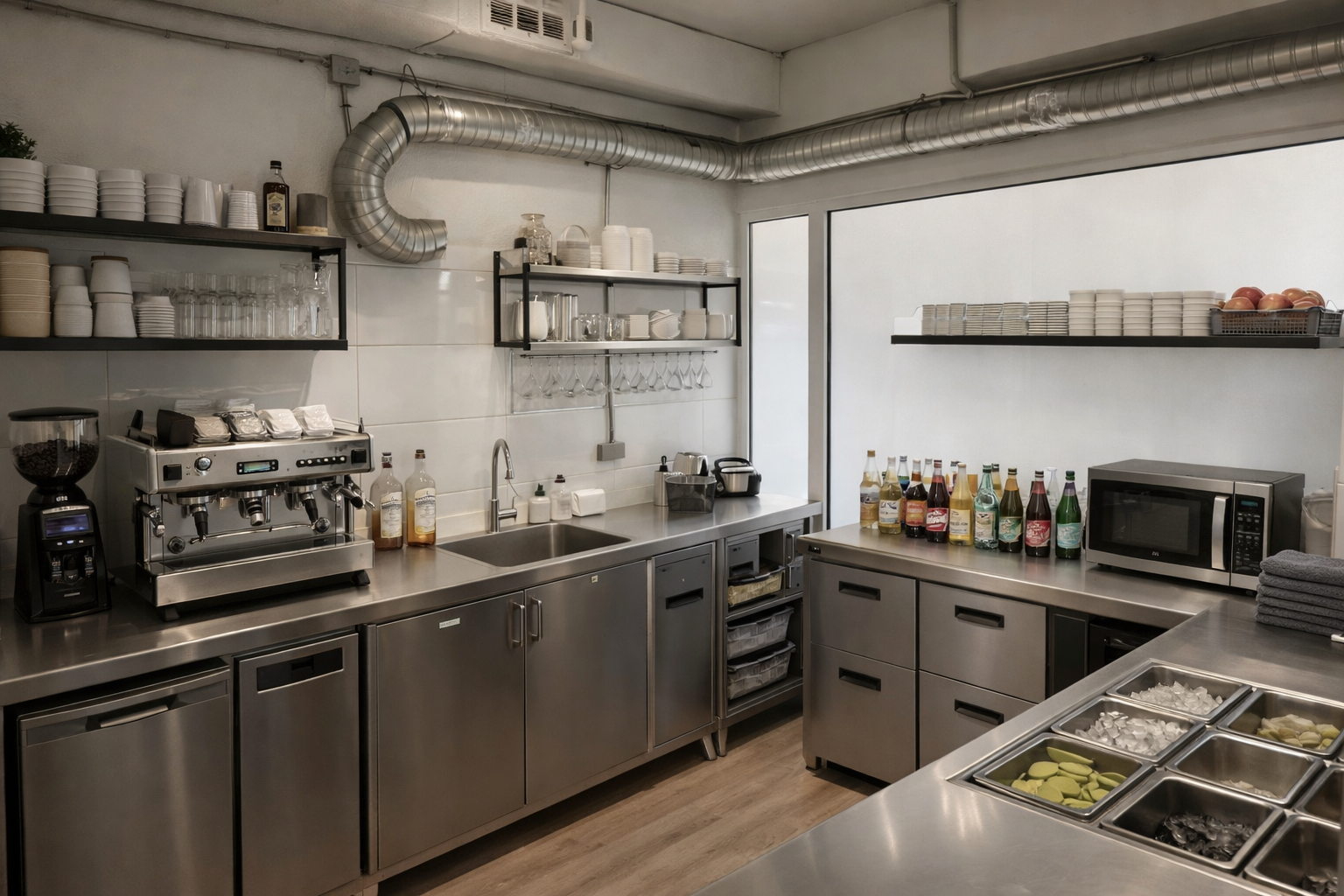 Wcześniej jedna z części pełniła funkcję zaplecza kuchennego, a druga strefy dla klientów — co czyni lokal idealnym pod gastronomię typu kawiarnia, snack bar lub take-away.