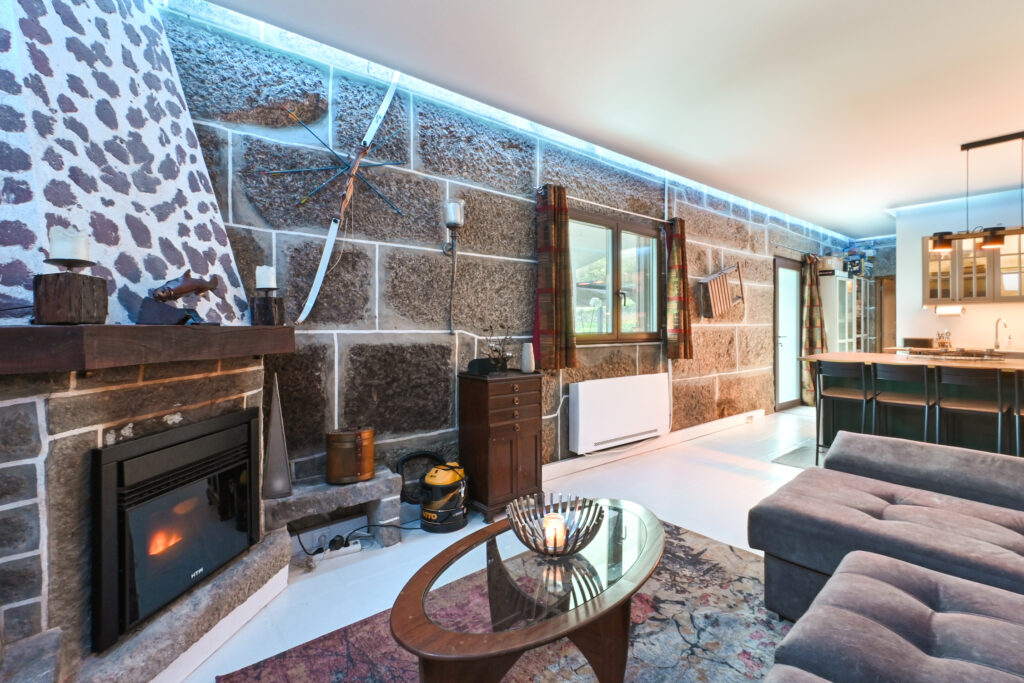 - Primeiro nível: sala de estar com lareira, cozinha aberta, quarto espaçoso com casa de banho privativa