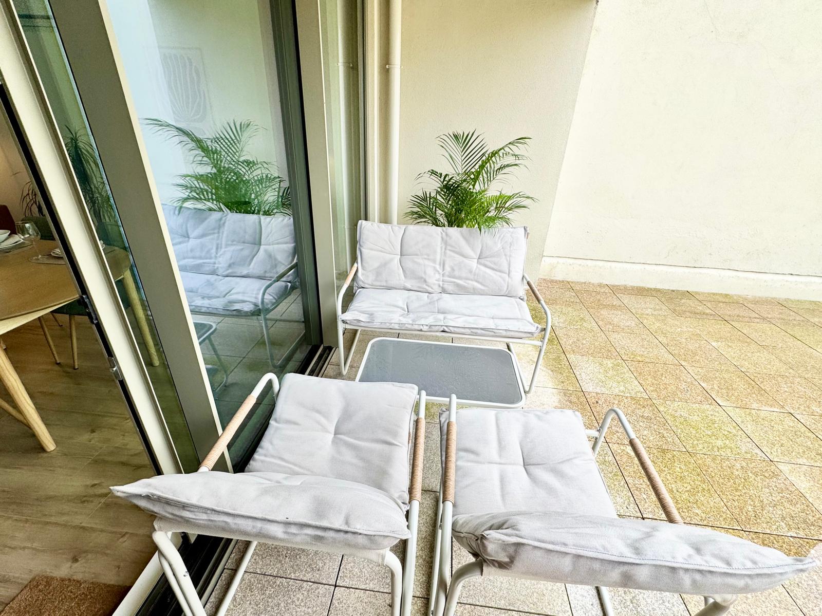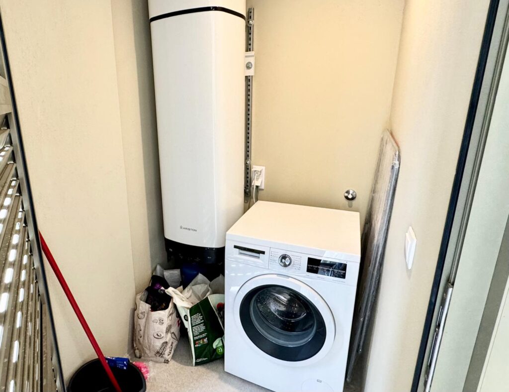 The open-plan living room and kitchen offer a spacious and functional layout, with a comfortable dining area and a fully equipped kitchen. A large west-facing terrace extends the space, perfect for unwinding. Includes a closed laundry area.