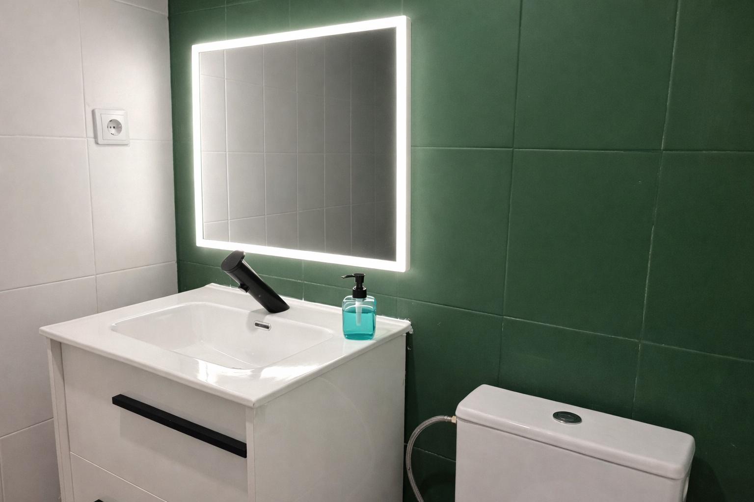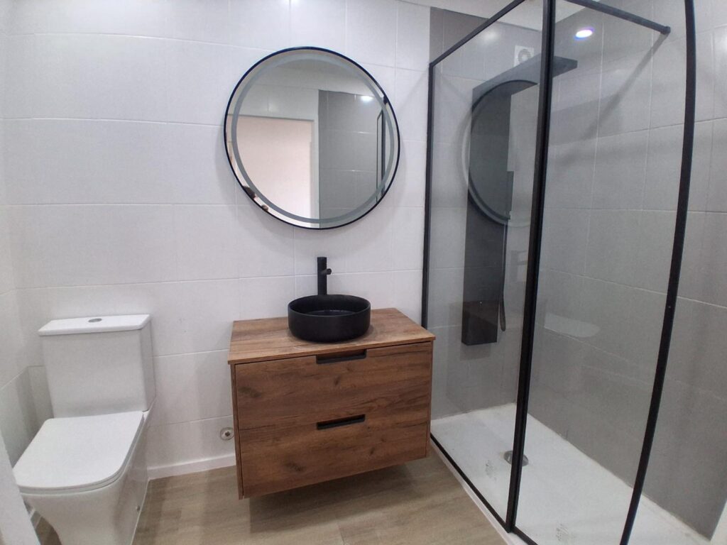 The apartment includes two bathrooms: a full bathroom with a walk-in shower and LED touch mirror, and a fully renovated guest WC.