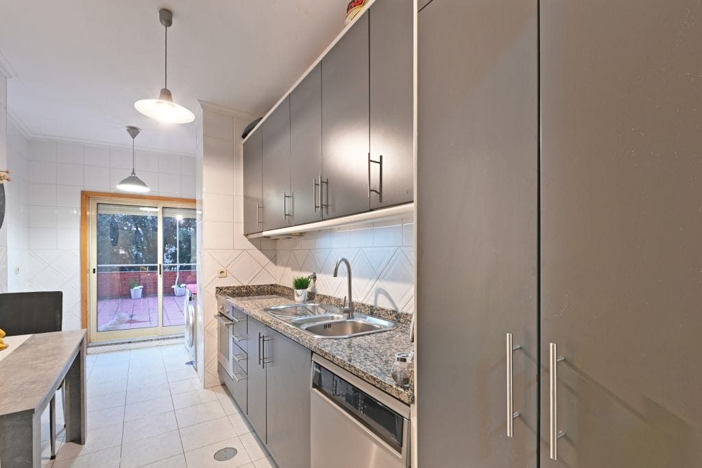 This apartment is situated on the ground floor of a well-maintained building and stands out for its generous indoor and outdoor areas. The bright living room, with designated seating and dining areas, offers direct access to a southwest-facing terrace, perfect for soaking up the sun. The kitchen, renovated about five years ago, is equipped with modern cabinetry and connects directly to the laundry area with access to the terrace.