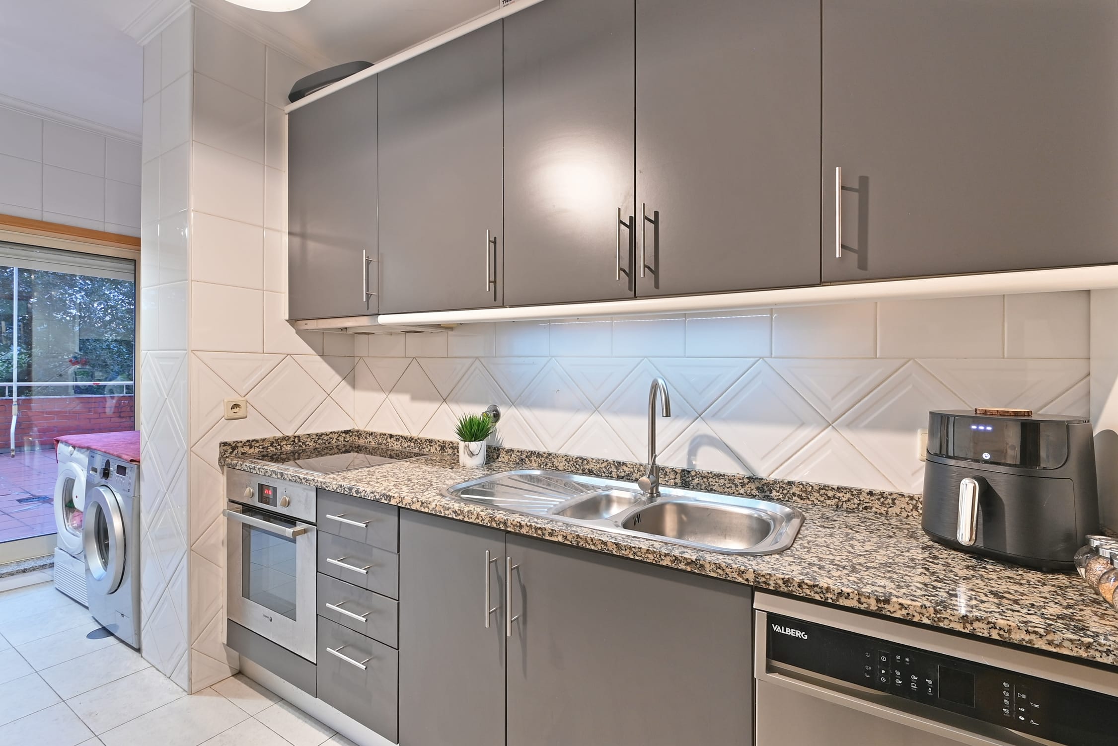 This apartment is situated on the ground floor of a well-maintained building and stands out for its generous indoor and outdoor areas. The bright living room, with designated seating and dining areas, offers direct access to a southwest-facing terrace, perfect for soaking up the sun. The kitchen, renovated about five years ago, is equipped with modern cabinetry and connects directly to the laundry area with access to the terrace.