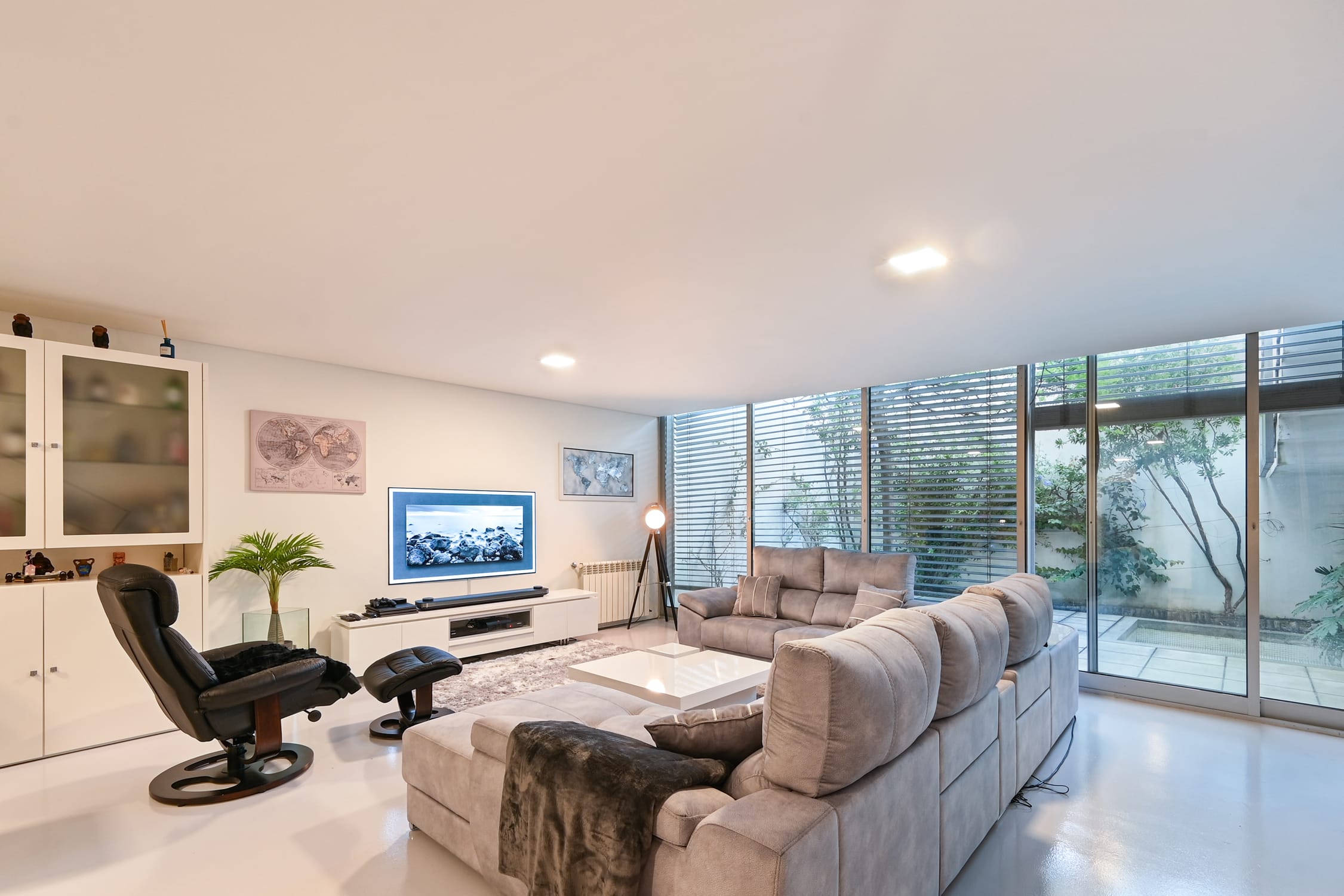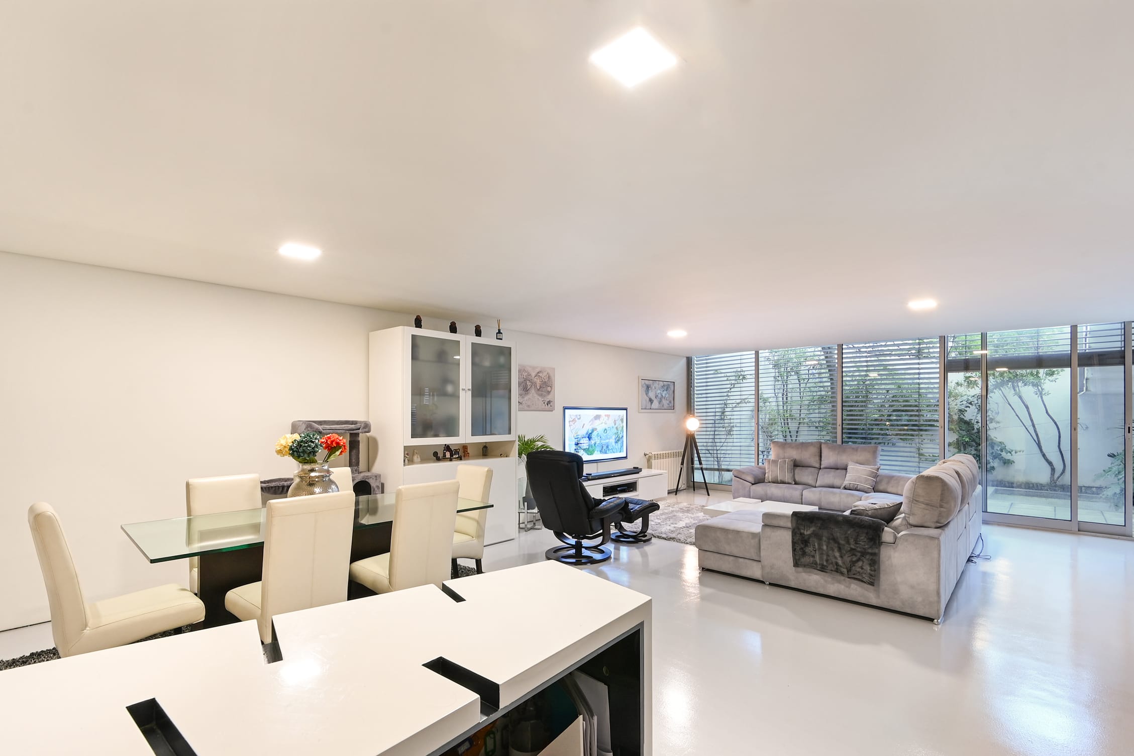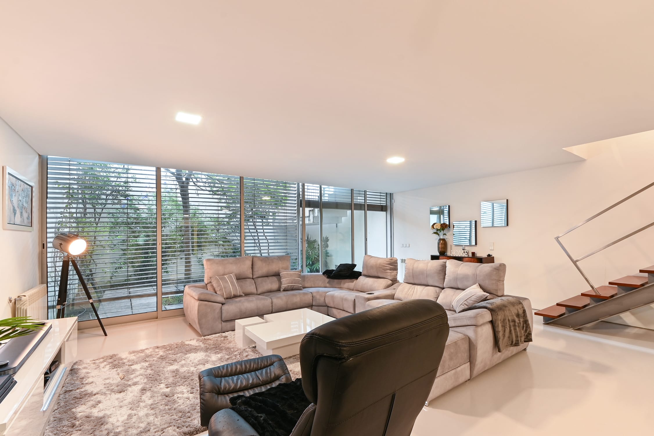On the lower floor, this townhouse offers a spacious lounge with a bar and natural lighting, ideal for relaxation and social gatherings. This floor also includes a bathroom, a fully equipped laundry, and access to a winter garden. The garage, measuring 69 m², has space for four cars and is equipped with resin flooring and custom-made cabinets, providing an efficient and organized storage solution.
